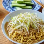 - Serve: Place the noodles and beansprouts into serving bowls and scatter the thinly sliced spring onions on top. Pour the loosened sauce over and allow diners to mix the noodles themselves.