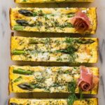 - Remove and Serve: Using the parchment paper edges, carefully lift the frittata out of the pan. If edges stick, gently loosen them with a butter knife. Transfer to a serving platter and slice between asparagus rows. Garnish with fresh herbs, additional parmesan, and optional prosciutto or other toppings. Enjoy warm or at room temperature for best flavor.