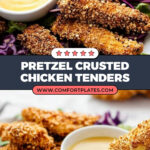 Crispy and flavorful Baked Pretzel Crusted Chicken Tenders featuring juicy chicken breast strips coated in a seasoned flour mixture, dipped in egg wash, and rolled in crushed pretzels for a crunchy crust. Baked to perfection, these tenders make a delicious and healthier alternative to fried chicken, perfect for a family dinner or as an appetizer served with your favorite dipping sauce.