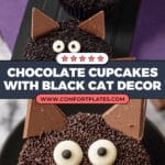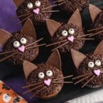 Delightful Black Cat Cupcakes featuring rich chocolate fudge cake batter combined with chocolate pudding mix and mini chocolate chips for extra fudgy texture. These cupcakes are topped with a luscious homemade chocolate buttercream frosting, coated with chocolate sprinkles, and decorated with Hershey’s chocolate ears, heart sprinkles, candy eyes, and pocky stick whiskers to create adorable black cat faces perfect for Halloween or any fun occasion.