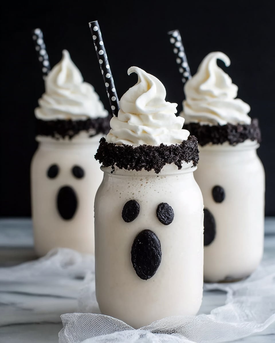- Assemble and Serve: Divide the milkshake evenly between four glasses. Scoop the whipped cream into a large Ziploc bag, cut one corner, and pipe a swirl of whipped cream on top of each milkshake to create a ghostly effect. Serve immediately for best texture and presentation.