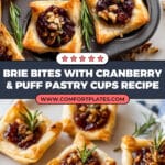 These Brie Bites with Cranberry are elegant, bite-sized appetizers featuring flaky puff pastry cups filled with creamy Brie cheese, sweet-tart cranberry sauce, and crunchy pecans, finished with a sprinkle of flaky sea salt and garnished with fresh rosemary. Perfect for holiday gatherings or sophisticated parties, these warm or room temperature bites balance savory and sweet flavors with delightful textures.