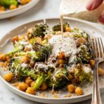 - Roast Broccoli and Chickpeas: Place both baking sheets in the preheated oven. Roast for about 20 minutes, tossing both halfway through cooking. Broccoli should be tender with light char marks and chickpeas should be a darker brown and crispy.