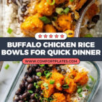 Buffalo Chicken Rice Bowls are a flavorful and satisfying meal featuring tender diced chicken breasts tossed in spicy buffalo sauce, served over a bed of brown rice and seasoned black beans. Topped with melted cheddar cheese and fresh scallions, this dish is perfect for quick dinners or meal prep.