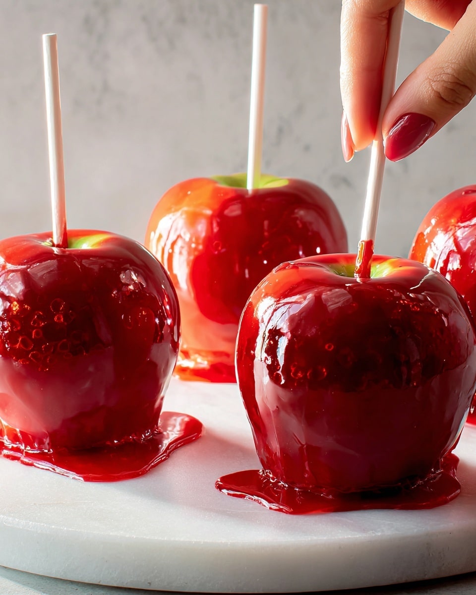 Classic homemade candy apples coated in a shiny, sweet red candy shell. This easy recipe features Granny Smith apples dipped in a boiling mixture of sugar, corn syrup, and red food coloring, creating a perfect festive treat with a crisp, vibrant exterior and tart apple inside.