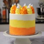 Start stacking with a dab of frosting to stick your first layer to the board. Spread an even layer of frosting between each cake layer. After stacking, apply a thin crumb coat all around and smooth it out using a bench scraper before chilling the cake; this step sets the base. Then comes the fun part: pipe and spread your colored frosting layers—yellow on bottom, orange in the middle, white on top. Smooth with the scraper again, and chill. If you’re feeling fancy, roll the sides gently in sanding sugar for that extra sparkle, then pipe frosting swirls on top using a Wilton 1M tip. It’s like candy corn heaven in cake form!