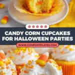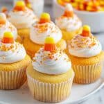These Candy Corn Cupcakes are a festive treat perfect for Halloween or any fun occasion. Featuring vibrant layers of yellow and orange vanilla cupcakes topped with a fluffy marshmallow frosting, candy corn, and sprinkles, they are as delightful to look at as they are to eat.