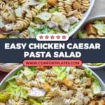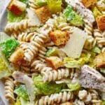 I’ve served this Chicken Caesar Pasta Salad Recipe in glass jars for picnics—layers of pasta, chicken, dressing, and croutons make for a pretty and practical presentation. It’s also fantastic arranged in individual bowls with extra garnish on top for a dinner party.