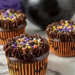 Delightfully rich and decadent Chocolate Cauldron Cakes featuring moist chocolate cupcakes filled with fluffy marshmallow cream, topped with a luscious bittersweet chocolate frosting, and decorated with fun sprinkles. Perfect for festive occasions or a special treat, this recipe combines classic chocolate flavors with a playful surprise inside.