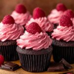 - Assemble the Cupcakes: Once the cupcakes are completely cooled, use a cupcake corer or a small spoon to remove a portion of the center from each cupcake. Pipe the raspberry chocolate ganache into the hollowed centers. Then, pipe generous swirls of the raspberry buttercream on top of each cupcake. Garnish each cupcake with a fresh raspberry. Serve and enjoy!