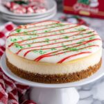 Microwave your vanilla frosting for about 1 minute so it’s easier to pour, then spread it smoothly over the top of your chilled cheesecake—still in the springform pan to keep it neat. Pop it back in the fridge for an hour until the frosting sets up nicely. Now for the fun part: sprinkle green sanding sugar all over to mimic the needles of a Christmas tree, and pipe wavy, curvy red stripes using frosting or melted candy melts. These colorful stripes are the iconic finishing touch that make this cheesecake truly festive and memorable.