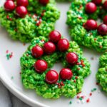 These festive Christmas Wreath Cookies are a delightful holiday treat made from buttery marshmallow-coated cornflakes shaped into wreaths and decorated with red candies, perfect for holiday parties and gifting.