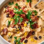 This Slow Cooker Cream Cheese Crack Chicken Chili is a comforting and creamy chili recipe that combines tender shredded chicken with flavorful spices, black beans, corn, and a cheesy cream cheese base. Perfect for a hearty meal that’s easy to prepare, this dish is slow-cooked to perfection and topped with shredded cheddar cheese, bacon bits, and fresh greens for added texture and flavor.