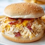 This Creamy Crockpot Crack Chicken recipe is a rich and flavorful meal perfect for easy weeknight dinners. Tender chicken breasts are slow-cooked with ranch seasoning and cream cheese to create a luscious, creamy base, then mixed with sharp cheddar cheese, crispy bacon, and fresh green onions. Served on buns, croissants, or tortillas, it makes for a delicious, crowd-pleasing sandwich that’s both comforting and indulgent.