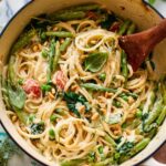 I don’t typically freeze this dish because I find the texture of the cream sauce and fresh vegetables suffers when thawed, but if you need to, freeze the pasta and veggies separately without the cream sauce, then add fresh sauce when reheating.