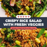 I store leftover salad and crispy rice separately—always keep the rice in an airtight container at room temperature or in the fridge to maintain crispness. The veggies do best covered in the fridge and tossed just before serving to avoid sogginess.
