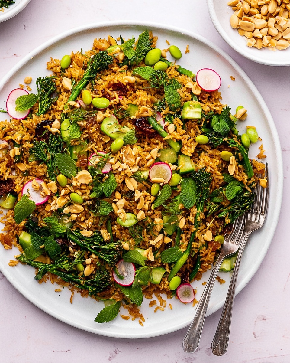 Transfer your tossed veggies and herbs onto a serving platter or divide between bowls. Top generously with the cooled crispy rice and sprinkle over your toasted, roughly chopped peanuts for that essential nutty crunch. If you want to serve this as a main, adding some tofu or grilled protein alongside works beautifully.