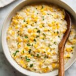 I wouldn’t recommend non-fat yogurt here as it tends to curdle when heated, altering the texture. Using 2% Greek yogurt keeps the creamed corn smooth and creamy without any separation.