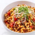 - Serve and Garnish: Spoon the American Goulash onto plates or bowls. Garnish with freshly grated parmesan cheese and chopped fresh basil leaves if desired. Serve warm and enjoy!