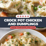 This Crock Pot Chicken and Dumplings recipe is a comforting, easy-to-make slow cooker meal featuring tender chicken breasts simmered in a creamy sauce with condensed soups, herbs, and vegetables. The shortcut dumplings are made from refrigerated biscuits, rolled and cut into strips, then cooked on top of the chicken and veggies for a delicious, hearty dish perfect for cozy nights.