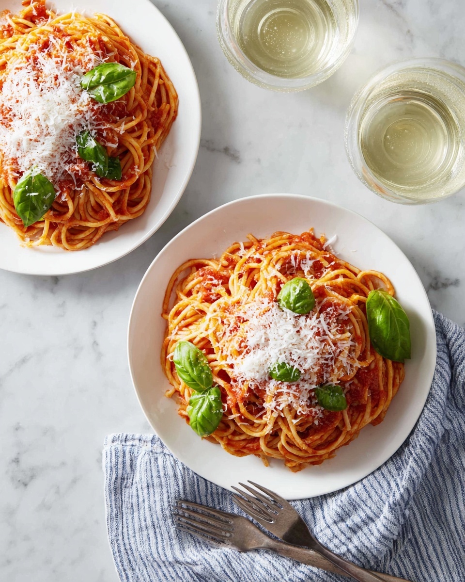 Pasta Pomodoro is a classic Italian dish featuring a simple yet flavorful tomato sauce made from whole peeled tomatoes, infused with garlic, red pepper flakes, and fresh basil, tossed with al dente spaghetti. This comforting weeknight meal balances the savory depth of cooked tomatoes with fresh herbal notes, perfect for a quick and satisfying dinner.