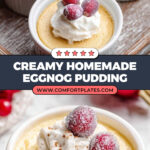 I’m obsessed with topping my eggnog pudding with a dollop of freshly whipped cream, a dusting of grated whole nutmeg, and a handful of sugared cranberries for a pop of color and tangy sweetness. It makes every spoonful feel fancy but still cozy.