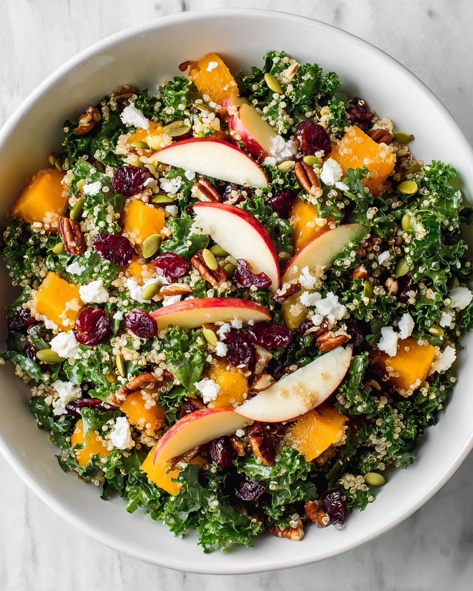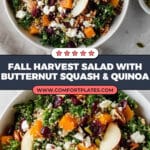 A vibrant and wholesome Fall Harvest Salad featuring roasted butternut squash, fluffy quinoa, fresh kale, and crisp apples, topped with dried cranberries, pecans, pumpkin seeds, and crumbled feta cheese. Tossed in a tangy apple cider vinaigrette, this salad combines seasonal flavors and textures for a nutritious and delicious meal perfect for autumn.