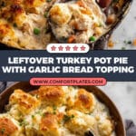 This Garlic Bread Leftover Turkey Pot Pie is a comforting and hearty dish perfect for using up leftover turkey. It features a creamy turkey and vegetable filling thickened with a roux, topped with buttery garlic bread chunks and melted cheese, then baked until golden and bubbly. A delicious twist on traditional pot pie, it combines rich flavors and satisfying textures for a cozy dinner.