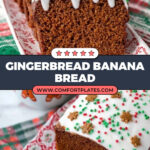 This Thanksgiving Gingerbread Banana Bread is a festive twist on classic banana bread, infused with warm gingerbread spices like cinnamon, ginger, nutmeg, and allspice. With a moist texture thanks to mashed bananas and molasses, it’s topped off with a simple powdered sugar glaze and holiday sprinkles to make it perfect for the holiday season.