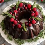 This Gingerbread Chocolate Bundt Cake Christmas Wreath is a festive and rich dessert combining the warming spices of lebkuchen and the deep flavor of cocoa. Moist and tender, it’s enhanced with chunks of lebkuchen chocolate in the batter and topped with a smooth semi-sweet chocolate glaze. Decorated with fresh cranberries, raspberries, and rosemary for a holiday touch, it makes the perfect centerpiece for your Christmas celebrations.