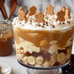 This festive Gingerbread Trifle is a delightful no-bake dessert combining layers of spiced ginger cake, crunchy gingerbread men, smooth vanilla custard, whipped ginger cream, and luscious caramel. Perfectly decorated with sprinkles and gingerbread crumbs, it’s an easy and impressive treat for holiday gatherings.