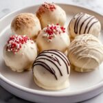 - Melt and Dip: Melt the white chocolate chips or wafers in a microwave-safe bowl, heating in 30-second intervals and stirring until smooth. Dip each chilled truffle into the melted white chocolate, letting excess drip off, then return to the parchment-lined tray. Add optional toppings while the coating is still wet.