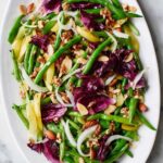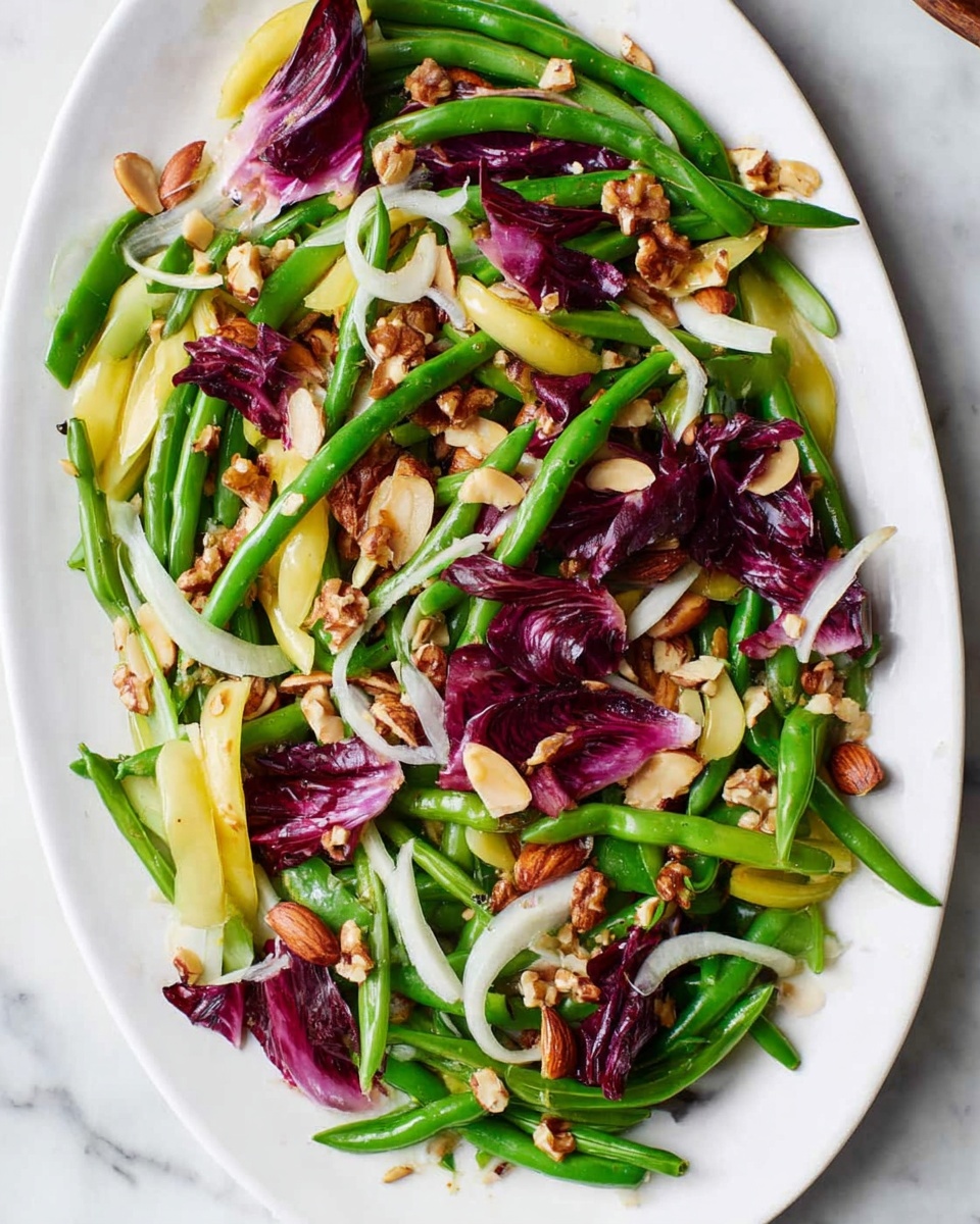 A refreshing and vibrant Green Bean Salad featuring crisp blanched green beans tossed with radicchio, red onion, and a honey mustard dressing. Topped with creamy goat cheese, crunchy walnuts and almonds, fresh tarragon, and flaky sea salt, this salad offers a perfect balance of textures and flavors ideal as a light side dish.