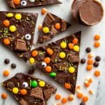 - Add Toppings: Sprinkle the cut-up Kit Kats, Reese’s Peanut Butter Cups, Reese’s Pieces, candy eyes, and Halloween sprinkles evenly over the melted chocolate while it’s still warm so they stick well.