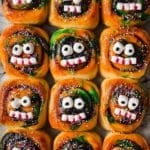 - Decorate and Serve: Once baked, remove rolls from oven and allow to cool for 5 minutes. Drizzle the green frosting evenly over the rolls. Arrange 4 marshmallow halves on each roll to resemble teeth, optionally adding red food coloring to create a ‘bloody’ effect. Add two candy eyeballs to each roll and sprinkle with additional Halloween sprinkles for a spooky finish.