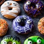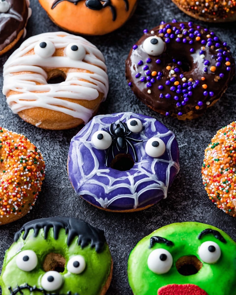 Celebrate Halloween with these festive and fun Halloween Donuts! Featuring a variety of spooky designs like Monsters, Frankenstein, Mummies, Dracula, and Spiderwebs, these decorated donuts are perfect for parties or a seasonal treat. Using colorful candy melts, candy eyes, black frosting, and creative piping techniques, you can transform glazed and chocolate-frosted donuts into adorable and creepy Halloween-themed desserts.