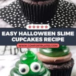 Halloween Slime Cupcakes are a fun and spooky dessert perfect for Halloween parties. These chocolate cupcakes are topped with a gooey, lime-flavored jello slime that’s decorated with candy eyes to create creepy slime monster treats that kids and adults will love.