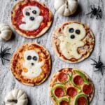 These festive Halloween Pizzas feature a soft, no-rise pizza crust topped with classic pizza sauce, melted mozzarella, and fun Halloween-themed toppings. Perfect for a spooky gathering or a fun family dinner, these mini pizzas offer a versatile canvas to get creative with your favorite toppings like pepperoni, bell peppers, olives, and more.