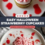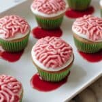 Delightfully festive Halloween Cupcakes featuring moist strawberry cake topped with a luscious homemade strawberry buttercream. These cupcakes are decorated with whimsical ‘zombie brain’ swirls and finished with a drizzle of strawberry syrup, making them perfect for spooky celebrations.