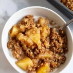 - Assemble the crumble: Lightly oil a small baking pan or line it with parchment paper. Spread the sautéed apples evenly across the base. Press the crumble mixture into larger clumps and scatter them over the apples to create a textured topping.