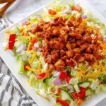 I don’t recommend freezing the whole salad because the veggies won’t hold up well, but you can absolutely freeze the cooked chicken mixed in the sauces. Freeze it in a sealed container or bag, then thaw it in the fridge when you’re ready — just toss with fresh veggies and lettuce, and you’re good to go!