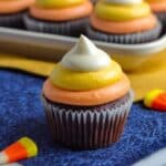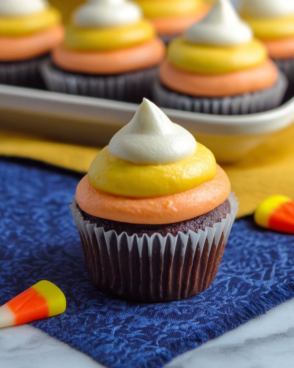 - Pipe frosting onto cupcakes: Using piping bags, pipe the yellow layer first in a circular motion, then add the orange layer on top, finishing with the white tip to mimic a candy corn effect.