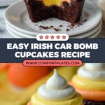 Indulge in the festive flavors of Irish Car Bomb Cupcakes, featuring moist Irish stout cupcakes filled with a rich Irish whiskey caramel mousse and topped with a luscious Bailey’s whipped buttercream in a vibrant candy corn-inspired swirl. Perfect for St. Patrick’s Day or any celebration, these cupcakes combine deep chocolate and stout notes with creamy, boozy delights.