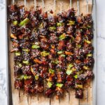 These Saucy Korean BBQ Beef Skewers combine tender tri tip or sirloin steak with fresh scallions and cremini mushrooms, all generously coated in a flavorful homemade Korean BBQ sauce. Perfectly grilled to deliver a sweet, savory, and slightly spicy taste, these skewers make a delicious and easy weeknight dinner or party appetizer.