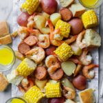 For parties, I like to spread everything out on a big wooden board lined with parchment paper—corn, potatoes, sausage, and shrimp piled high. Everyone digs in family-style, which instantly turns dinner into a festive occasion. Adding small bowls of melted butter and cocktail sauce at different spots makes it super easy for guests to grab what they want.