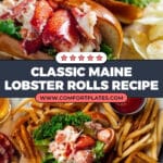 Classic Maine Lobster Rolls featuring tender chunks of cooked lobster meat lightly tossed in mayonnaise and celery, served in buttery, griddled split-top hotdog buns. A quintessential taste of New England’s summer, perfect for an easy yet elegant meal.