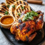 This Roast Chicken with Mango Chutney Glaze is a flavorful and aromatic dish featuring a whole chicken marinated in a blend of garlic, lemon, and warming spices like ginger, coriander, turmeric, and smoked paprika. The chicken is oven-roasted to juicy perfection and finished with a sweet and spicy mango chutney glaze, delivering a deliciously golden, tender, and vibrant main course perfect for family dinners or special occasions.