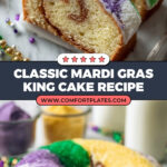 Celebrate Mardi Gras with this traditional King Cake recipe featuring a soft, sweet dough filled with either a cinnamon sugar mix or creamy cheese filling. Braided and baked to golden perfection, then topped with a lemon-vanilla glaze and colorful purple, green, and gold sugar—the perfect festive centerpiece for your Mardi Gras party.