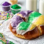 Celebrate Mardi Gras with this traditional King Cake recipe featuring a soft, sweet dough filled with either a cinnamon sugar mix or creamy cheese filling. Braided and baked to golden perfection, then topped with a lemon-vanilla glaze and colorful purple, green, and gold sugar—the perfect festive centerpiece for your Mardi Gras party.