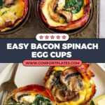 Delicious and protein-packed Mushroom Spinach Bacon Egg Cups, perfect for a nutritious breakfast or brunch. These savory egg muffins combine crispy baked bacon, sautéed mushrooms and spinach, and creamy feta cheese, all baked together in a muffin tin for an easy, grab-and-go meal.